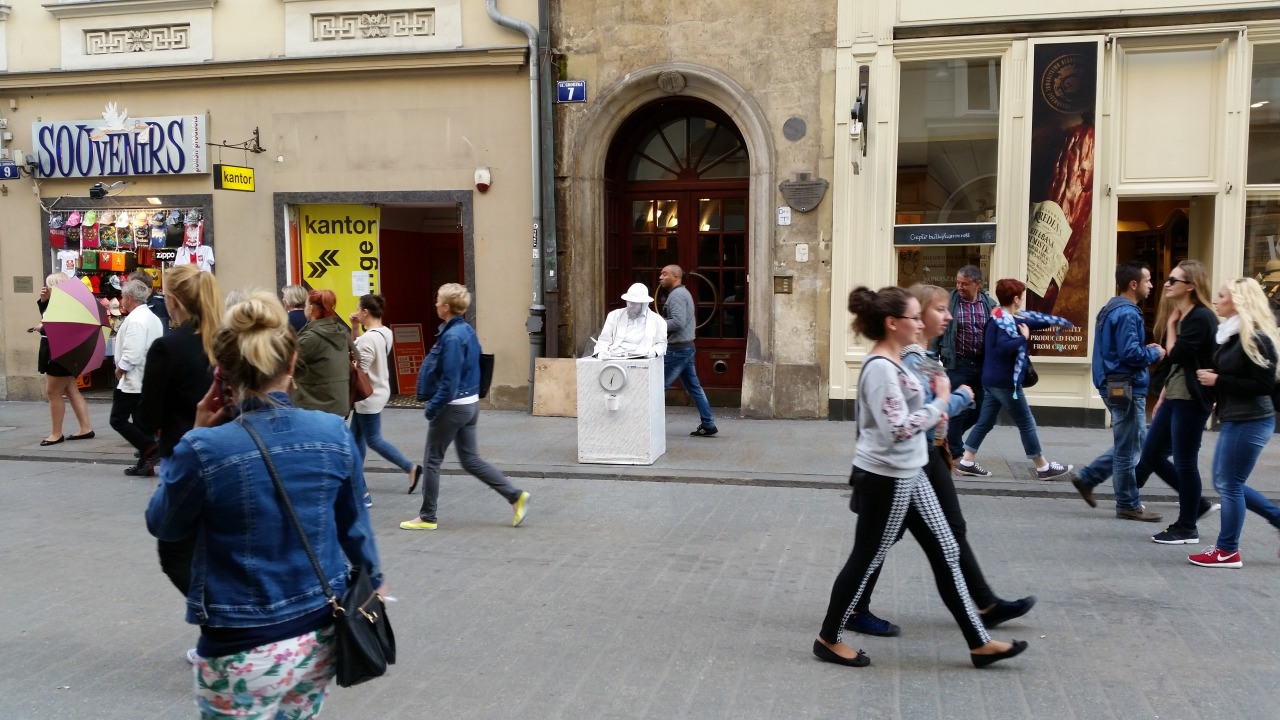Konferenci máme za sebou a centrum Krakowa bylo taky celkem fajn. Lidé tam hodně běhají, jezdí na kole, kolečkových bruslích, občas i na segwayi a dále lze potkat i kočáry s koňským spřežením. Díky tomu je v centru mnohem lepší vzduch než poblíž hlavních motoristických tahů. Pak různí kejklíři, pouliční hudebníci, nabízeči letáků, slečna lákající velmi milým hlasem do strip klubu, free hugs, holubi, kebab, zmrzlina, prasátko “I love tips”, suvenýry a velká různorodost národností (především na hotelu). A ještě nesmím zapomenout i na pěkné holky :-). Vždy se mi líbila ta typická polská módní výstřednost.